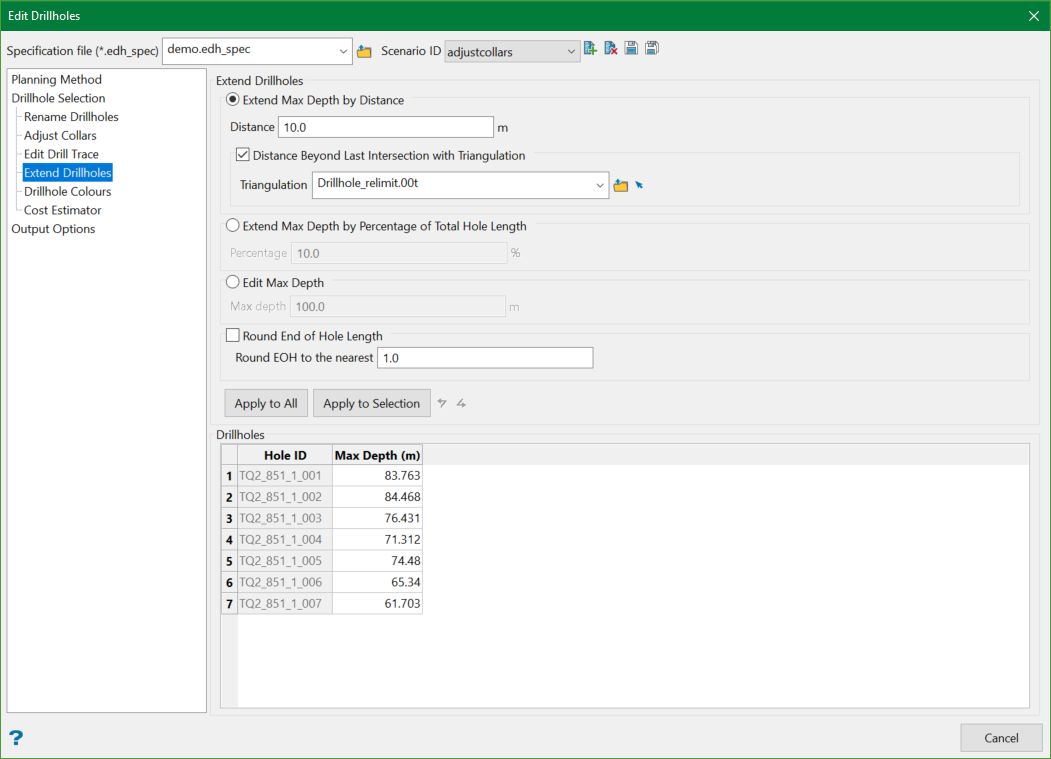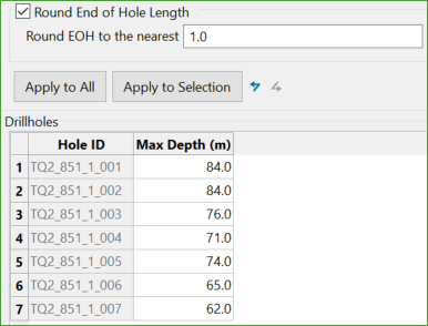 Extensions can be applied to all drillholes using the Apply to All button or to those currently selected in the grid by using the Apply to Selection button.