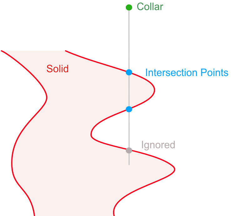 In a scenario, as shown in Figure 3, where there are 3 intersection points with the drillhole and the input triangulation, the third intersection point would be disregarded.
