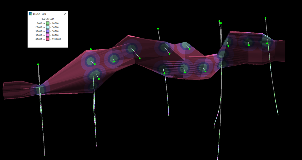 Use this option to evaluate the current density of the selected drillholes within a triangulation, based on user-defined distance ranges. This helps in identifying future drilling targets by highlighting gaps in current drilling.