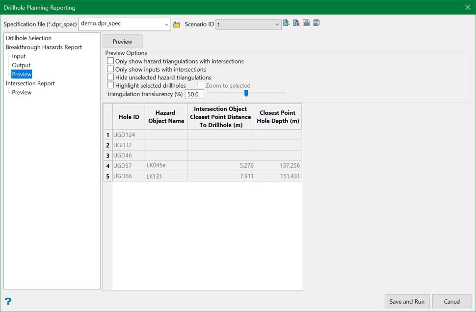 This section allows users to view the calculated drillhole hazard triangulation(s) on the screen with all hazard input data, while the Reporting panel is still displayed. The selected drillholes to create drillhole hazard triangulation(s) for, will be listed in the grid, with any drillholes that have intersections with input data listing the first intersection encountered downhole in the grid.