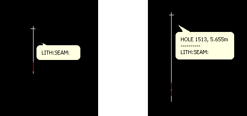 Select the Display Heading check box to view drillhole information, such as the drillhole name and depths, as a header in the displayed data tip. In the following diagram, the data tip on your right is displaying the heading information while the data tip on your left is not.