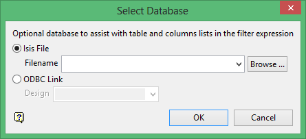 The selection filter can be applied to a nominated Isis database or ODBC link. Selecting a database will result in table and field lists being provided through the Build Expression panel.
