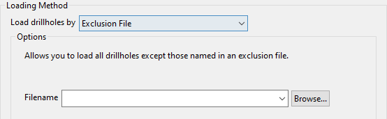 Unlike the Load drillholes by Selection File method, which loads all of the drillholes listed in a nominated file, the Exclusion File method will exclude the listed drillholes from being loaded, i.e. only the drillholes that are not listed in the file will be loaded.