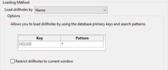 Select the method of displaying the drillholes by using the Method drop-down list. An explanation of each method is Use the drop-down menu to select the method to use for loading the drillholes..