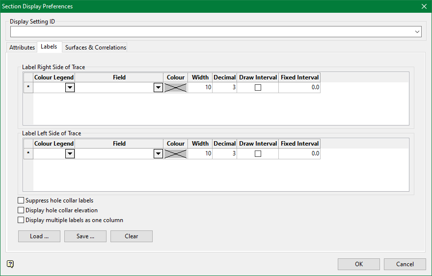 Use the Display Settings option to configure the display attributes for the drillhole data viewed through the Drillhole Section Window, for example display patterns and settings, trace labelling, patterns for correlations etc. The display settings configured through this option will be saved in your <proj>.gute_spec file. This file, which should not be edited manually, will be stored in your current working directory.