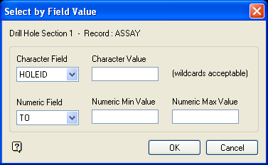 Select, from the drop-down list, the character field that you want to use to locate the corresponding intervals. You will also need to specify the character value that will be used to match against the bore intervals. Wildcards (* multiple character and % single character) can be used.