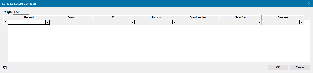 Use the Database Record Definition option to create the record definition for the current drilling database. Defining the database records is required for most of the operations under the Drilling Utilities submenu. The definition will be saved to the <proj>. gute_spec file.