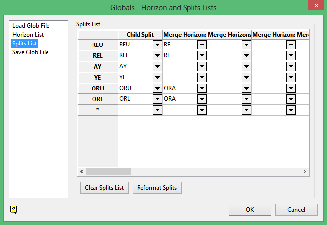 On the Geology menu, point to Drilling Utilities, and then click Horizon List to display the Globals - Horizon and Splits Lists panel.