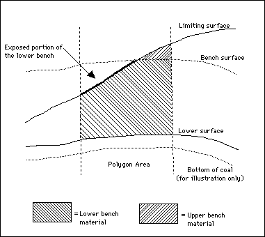 The limiting surfaces must be defined by grids; the bench may be defined by a grid or as an elevation (i.e. a flat plane). The limiting surfaces may be offset in either direction. The bench can also be defined as a grid and an offset. This allows you to define benches, such as "90 foot above top of coal".