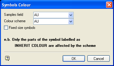 Enter or select from the drop-down list, the colour legend (in the Samples colour scheme) that will be used for the specified field. For example where Fe is greater than 10.0 the symbol displays in red, where Fe is less than 10.0 it displays in blue.