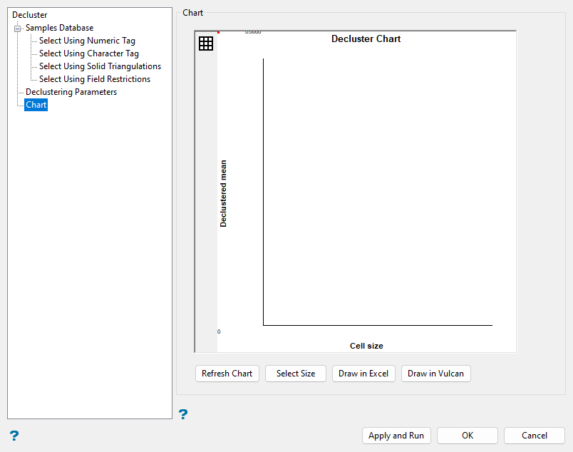 The Chart section allows you to produce a preview of the overall declustering process as well as interactively select a definitive cell size for the calculation of declustering weights.