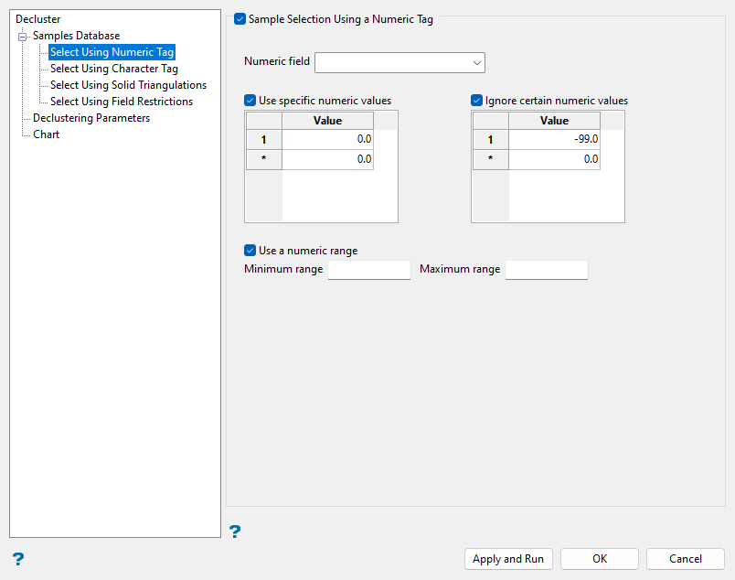 Use numeric tags as needed to filter sample data for declustering based on numeric values of a selected field.