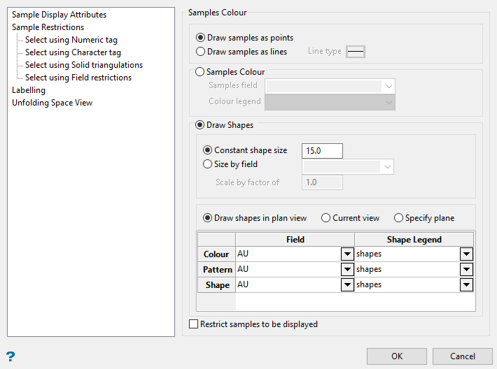 Draw Shapes will apply shapes to the samples instead of using points or lines. The colour and style of the shapes will be based on the SHAPE legend selected.