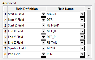 In the Advanced section, users can assign fields. AÂ Rather than requiring names to match, simply match a definition to a name. For example, the diagram below shows how this applies to drillhole samples.