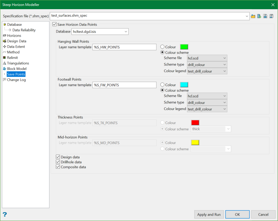 For hanging wall and footwall points, select the scheme file, type, and colour legend from the respective drop-down lists.