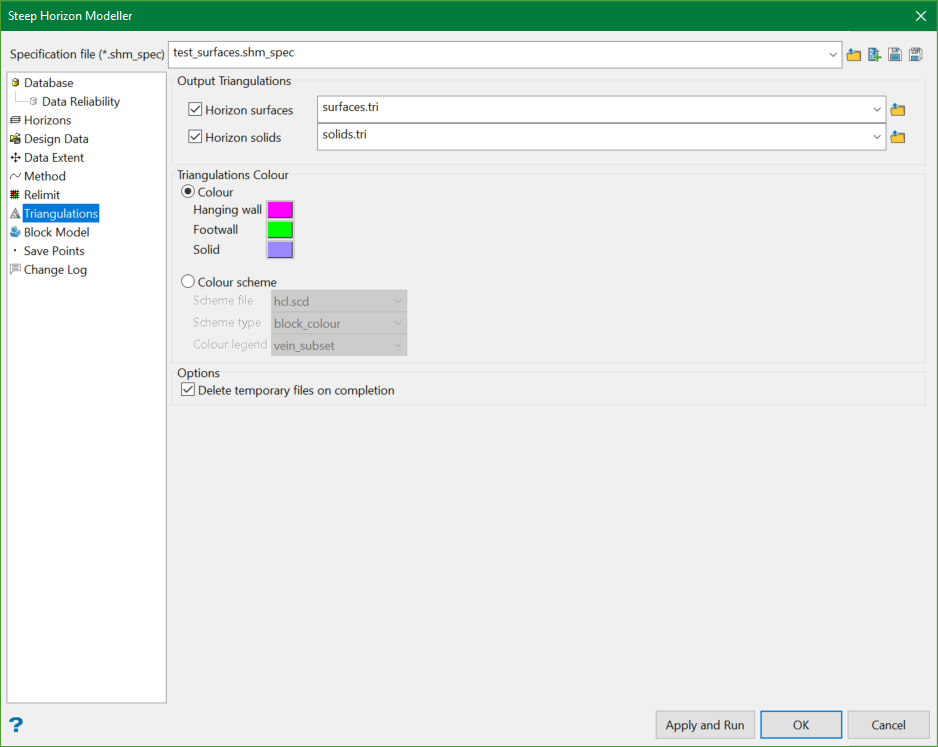 Note: Â The output surface triangulations are named with the convention <proj><horizon>.hwt for hanging wall or <proj><horizon>.fwt for footwall, where <proj> is the project prefix and <horizon> matches what is defined in the Horizons.