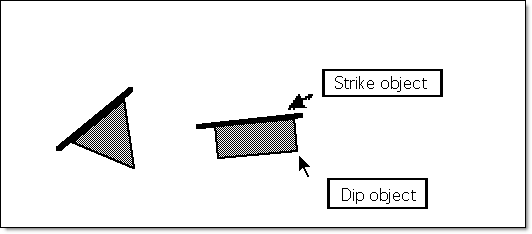 The centre point of the strike-line is the true location (Easting, Northing and RL) of the structural feature. The angle formed between horizontal and the dip object is equivalent to the dip value; the dip object will be pointing in the dip direction (i.e. at 90 degrees to the strike-line).