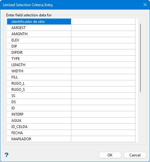 Limited Selection Criteria Entry panel - Geotechnical Data