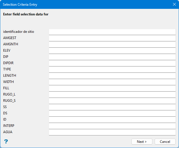 If you ticked the By database field criteria checkbox, the Selection Criteria Entry wizard starts, starting with the panel below.