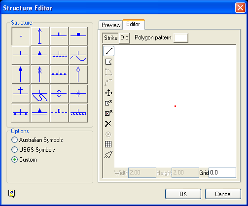 This section contains a collection of predefined Geotechnical symbols. The units defined in your project specification file (.dg1), i.e. metric or imperial, will dictate which symbols are displayed through the Structures section i.e. Australian or USGS. No matter the default, either set of symbols will be available for use.