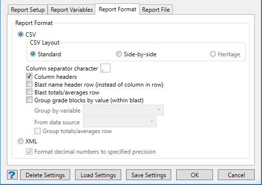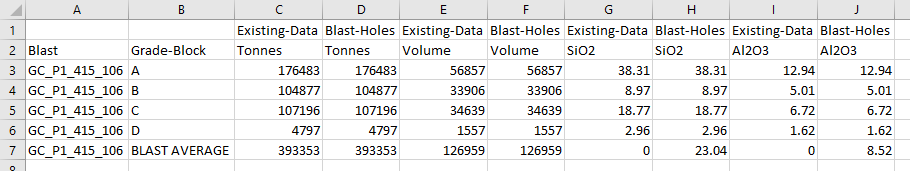 Use Blast Report to report on the grade block or blasthole data in the currently loaded blast(s). Unlike the Blast Preferences option, which to post a blast report onto the screen, the Blast Report to send a blast report to a nominated CSV file.