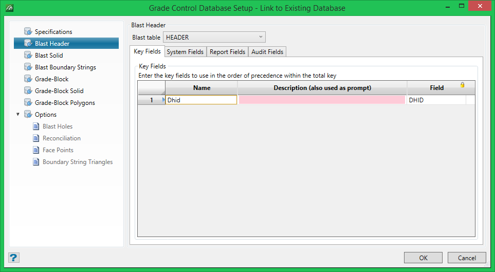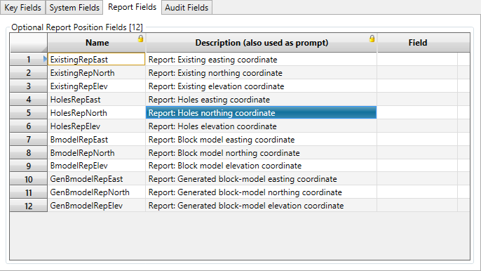 In the case of an Isis/ODBC database the fields comprising the key are also pre-defined in the database description. So, the fields (GradeControl_ri.htmost column) and the number of entries (rows) in this data-grid are both immutable. However, the Name and Description columns can both be changed as required. By default, the Name will be the same as the Field (name in the DB) and the Description will be the same as the description given in the database. In both cases they will be rendered ‘readable’ by having the first character ‘capitalised’ and the rest ‘lowercased’. However, both of these can be edited as desired – as in the example above, where the RL field is referred to as “Bench” and the BLST fields as “Blast”. It is worthwhile to make these readable – these Names and Descriptions will be used throughout the system to refer to these items (see, for example, the panel used for selecting blasts).