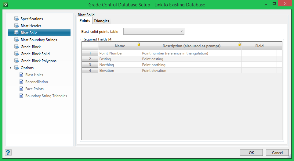 There are 4 required fields from the points table: point number, easting, northing and elevation. These can be selected using the drop-lists on the cells in the Field column. The data-types of these fields will be checked for validity when saving the setup.