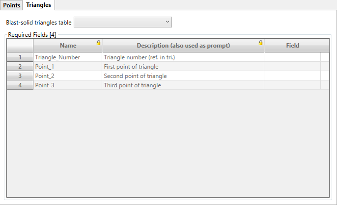 The table name for the triangles information (point connection group for each triangle) must be selected. There are also 4 required fields from this table: triangle number, number of point 1, number of point 2 and number of point 3 that describe a triangle.