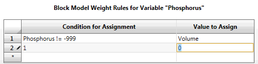 Here, we will only get a weighted value if the Phosphorus value is not still set to the default value; if it is it will be multiplied by a zero weight accumulating nothing to grade-block.