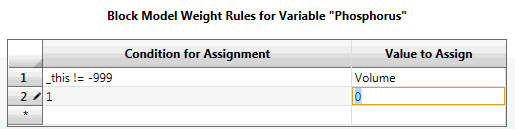 Condition is 1 (i.e. always apply this weight rule) and the rule value is ‘Volume’ so that it will use block volume weighting.