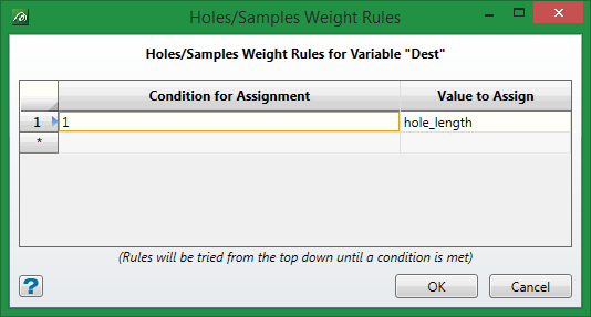 This column will only be enabled if one of internal blast holes, external drill-holes or external samples have been specified as the source on the Hole/Sample Source Tab in Data Source Definitions. This allows the user to specify how values from the source are to be weighted when used for any of weighted Grade-Block Rule Types (Wtd. Mean, Std. Dev., and Variance).