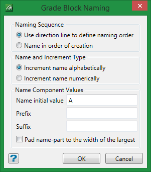 Select this check box if you want the order of the grade block names to be based on the direction of a designated line, for example label from right to left or top to bottom. You will be required to indicate the directional line once the Grade Block Naming panel has been completed. If this check box is not selected, then the grade block names will be randomly assigned.