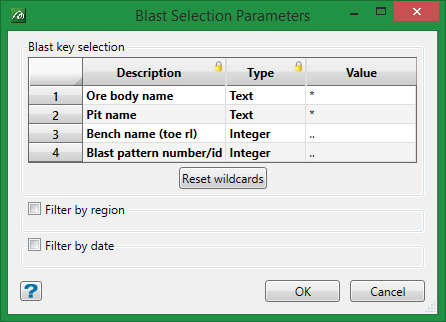This option allows you to constrain the blast holes by date. Select from choice of Audit dates, the select the starting and ending dates.