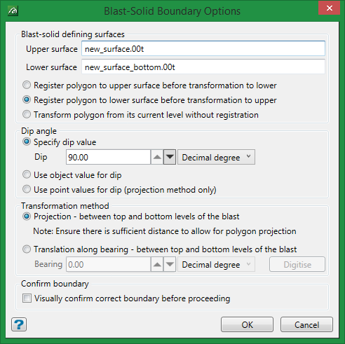 Select whether to register the polygon to the upper surface, the lower surface, or to continue without registering it to either surface. With a dip angle of 90 degree (straight up) registration will not make a difference. However, if the dip is at an angle other than 90 degrees, then the aerial offset could be significant depending on the distance the polygon is above the surface. In such cases, we recommend registering the polygon to the surface.