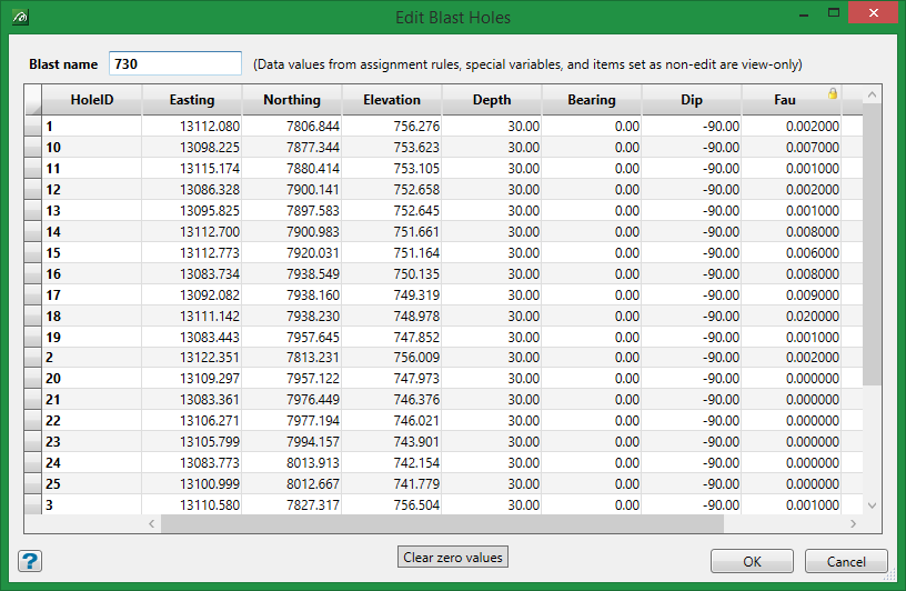 After selecting criteria, click OK to display the following Edit Blast Holes table.