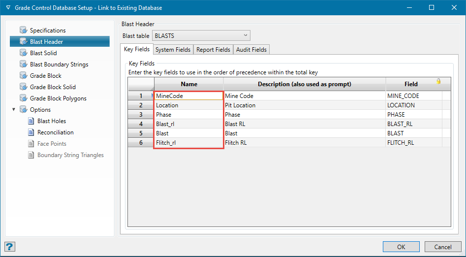 The fields displayed on this panel are set in the Grade Control Database Setup > Blast Header pane.