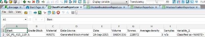This is formatted simply as a classic dilution report to provide what is missing from the Dilution-Breakdown data – an easy to read assessment of the dilution from the classified material; i.e. how much other material is included in the grade-block along with the material type it is classified by.