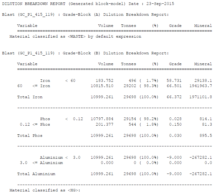This information is presented as a short section for each grade-block being reported. This section comprises a summary header line for the grade-block – with the material type and dilution percentage away from it. The rest of the section is simply the breakdown of the dilution as volume and mass for the classifying material and other (diluting) material.