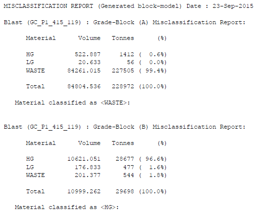 In this example, grade-block A is classified as WASTE, but 0.6% of the grade-block material is not WASTE (comprising 1468t). Whereas grade-block B is classified as HG, but 3.4% of the grade-block material is not HG (comprising 1021t). These results illustrating that the dilution material will be different for each block, depending upon its material classification. The dilution measure gives an indication of how good the division into grade-blocks was from the original blast.