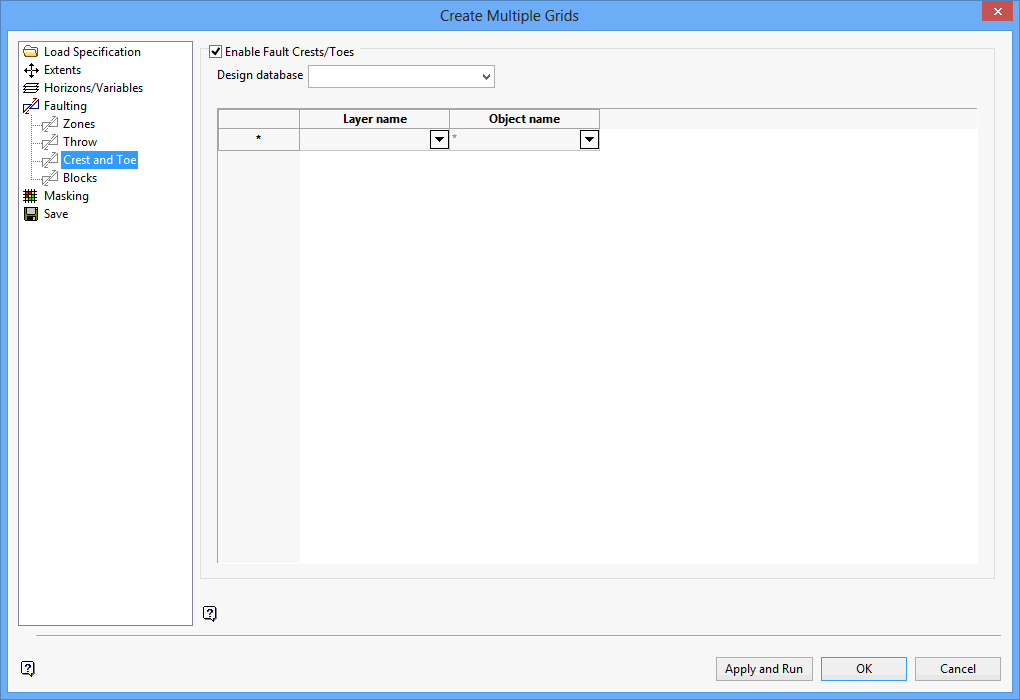 Specify the horizon(s) that you want to fault and supply the relevant layer and object names in the available grid fields. Wildcards (both * multiple and ? single character) can be used. Any layer selected should include information for both crest and toe locations, and will need to be exclusively string data.