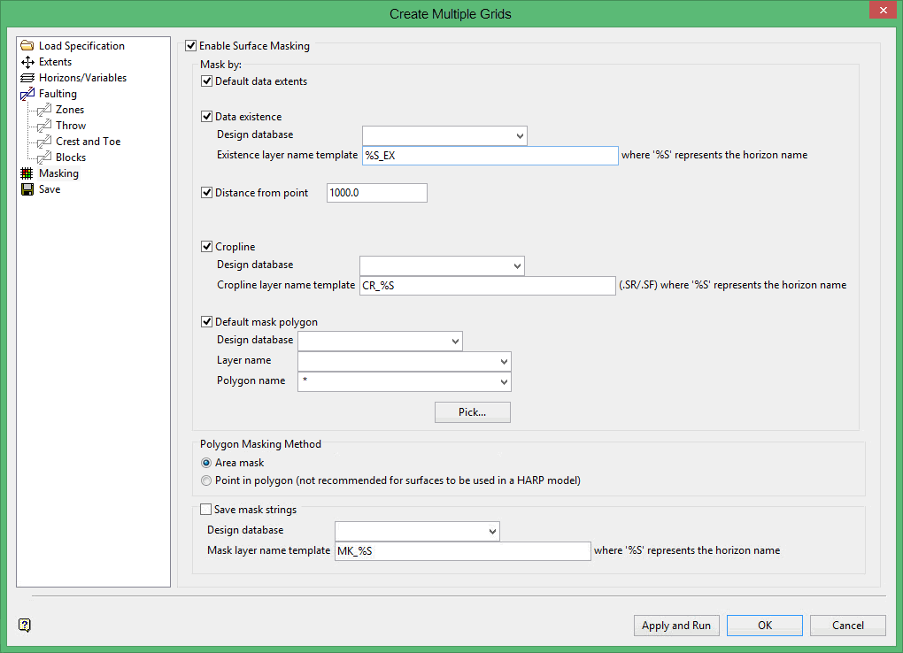 Select this check box to supply a single layer and object combination which will be applied as a mask to all the horizons modelled, for example, a lease boundary. You will need to specify the design database, layer and polygon names. The specified layer must contain one or more polygons.