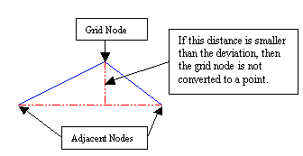 This option treats the X grid lines (that is, the lines that run north and south) as a line (string of coordinates) and then in a process similar to the Design > Object Edit > Filter option removes a grid node if the distance between the node and a line joining the two nodes either side of it is less than the deviation value.