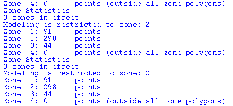 Use Query Fault Zones to query the current settings for using zones. The Grid Calc Report Window displays the number of zones available, the identifier and number of data points in each zone, and whether any specific zones have been selected for modelling.