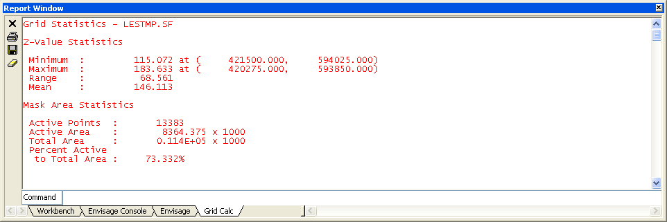 Use Statistics to display statistics relating to the last grid loaded. The minimum and maximum grid values, the Z range, the Z mean, the number of active (not masked) points, the active area (actual area of region not masked) and the total grid area displays through the Report Window.