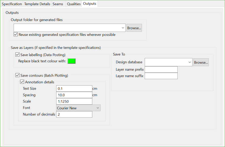 The contours that are generated will also be saved to the relevant layer name and the major and minor contour intervals will be defined by the contours column in the Qualities tab. The contour annotation font and text size will be the same as the font text size defined in the template .dps.
