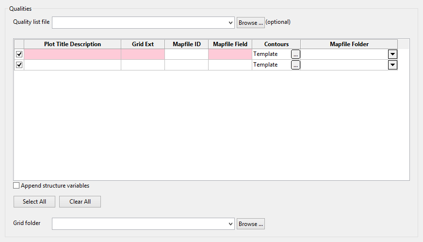 This grid contains the descriptions of all the qualities (and/or structural variables) which will be processed along with the seams from the ‘Seams’ tab.
