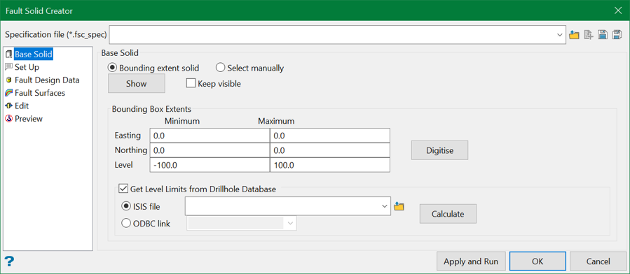 Specification is a pre-saved file that contains the selections for the panel elements. The Fault Solid Creator specification files have extension .fsc_spec.