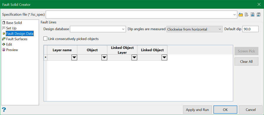 Select a design database from the drop-down list that contains the required fault lines. Choose the direction on how dip angles are measured. Similar to Throw Faulting in Integrated Stratigraphic Modelling, the dip angles can be encoded into the names of the individual points on the line. For points that do not have the angle encoded in their names, the default value is used.