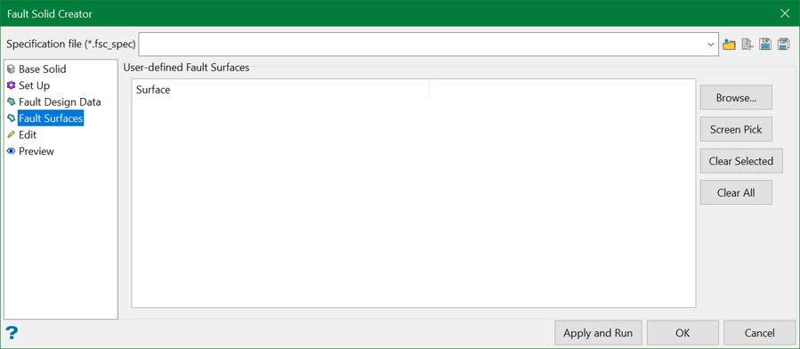 Users can either browse for the fault surfaces or pick them from the screen.