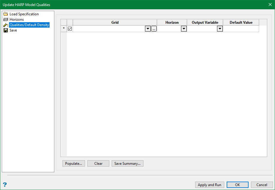 In the example above, burden horizons are available to write to the resultant HARP model. Select the relevant grid and enter the required Default.